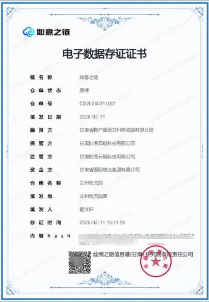 此次業(yè)務(wù)全程依托集團(tuán)公司所屬陸港云鏈公司開發(fā)的“甘肅港口信息一體化平臺(tái)”線上操作,通過貨物數(shù)字化監(jiān)管、數(shù)據(jù)實(shí)時(shí)聯(lián)通,將傳統(tǒng)紙質(zhì)倉單升級(jí)為不可篡改、可追溯的電子憑證,并對(duì)接“如意之鏈”區(qū)塊鏈平臺(tái),實(shí)現(xiàn)倉單生成、質(zhì)押等全流程存證,大幅提升倉儲(chǔ)與融資的透明度和安全性。