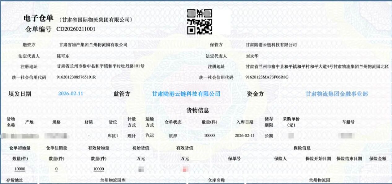 2月11日,甘肅國(guó)際物流集團(tuán)首筆電子倉單質(zhì)押融資業(yè)務(wù)成功落地,標(biāo)志著集團(tuán)公司供應(yīng)鏈金融服務(wù)邁入數(shù)字化、平臺(tái)化新階段。該筆業(yè)務(wù)以集團(tuán)公司倉庫1萬件快消品為標(biāo)的生成數(shù)字化倉單并完成融資,開創(chuàng)了“數(shù)字監(jiān)管+電子倉單+線上融資”的新模式,為中小企業(yè)搭建了高效便捷的融資渠道,更為全省倉儲(chǔ)資源賦予金融屬性、引入資金活水打下了良好基礎(chǔ)。
