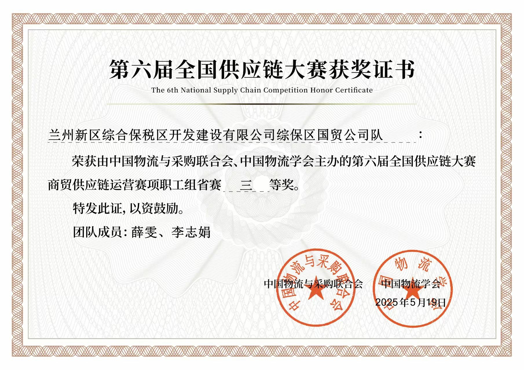 2025年5月 中國物流與采購聯(lián)合會、中國物流學(xué)會授予“第六屆全國供應(yīng)鏈大賽商貿(mào)供應(yīng)鏈運營賽項職工組省賽三等獎”